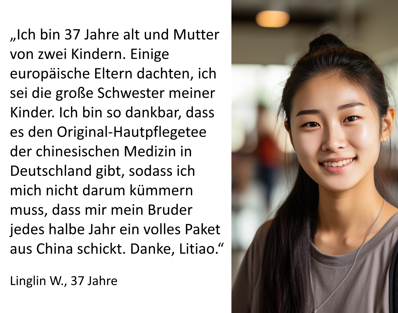 "Dank des TCM Skincare Heilkäuter Tees aus China hat sich meine Haut komplett verbessert. Unreinheiten sind verschwunden, mein Teint strahlt, und mein Selbstbewusstsein ist gestiegen."